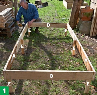 Tämä istutuslaatikko koostuu kolmesta kehikosta. Ne tehdään pitkistä sivuista (A, B ja C) sekä päädyistä (D). Alin istutuslaatikko pystytetään tukevasti kuuden tolpan (E) varaan, jotka asennetaan kehikon nurkkiin ja pitkien sivujen keskelle. Sivut kootaan kapuloilla (G).