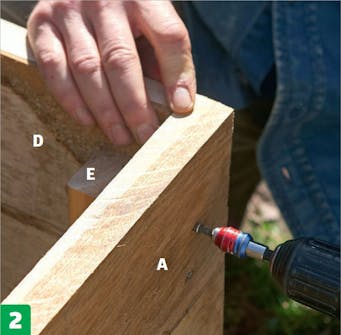 Rakenna istutuslaatikko. Ylimmissä osissa ei ole keskitukea, mutta pitkä puristin pitää päädyn paikallaan ruuvaamisen aikana. Kokoa kehikot valmiiksi, ennen kuin ruuvaat ne kiinni toisiinsa.
