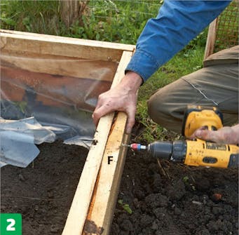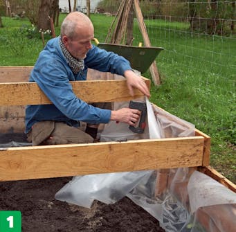 Asenna suojamuovit. Muovia voi olla vaikea saada suoraan, mutta sillä ei ole väliä, koska penkit täytetään mullalla. Kiinnitä muovit kehikoihin hakasilla.
