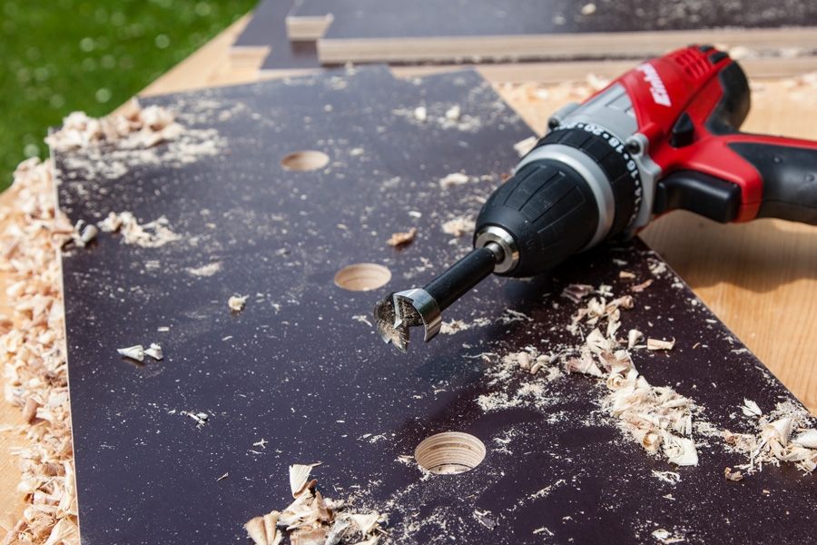 Samalla osiin porataan valmiit ruuvin reiät, jotta ruuvit eivät halkaise osia. Voit tehdä itsellesi kätevän, poraa-mista helpottavan ohjaimen. Kiinnitä työ pöytään apurima ja merkitse siihen osien paikat sekä porauskohdat.