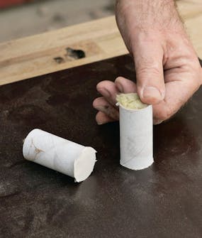 Salaojitusreiät tehdään kahden 6 cm pitkän pahviputken avulla. Täytä putket paperilla tai mineraalivillalla. Kiinnitä pahviputket liimanokareella tai kaksipuo-leisella teipillä muotin pohjaan.