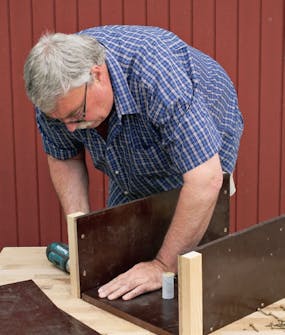 Sivut ruuvataan kiinni pohjaan. Aseta jokaiseen kulmaan vahvikelistat. Ne tuovat ruuvaukseen hieman lisää materiaalipaksuutta ja vahvistavat kulmaliitoksia.