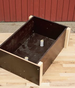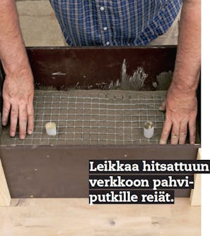 Muottiin tulee tehdä sala-ojitusreiät, joiden kautta liika vesi pääsee ulos kukkalaati-kosta. Aseta muotin pohjalle pari pahviputkea, joihin ei pääse valuvaiheessa betonia. Näin laatikon pohjassa on kaksi reikää, kun lopuksi poistat valumuotin.