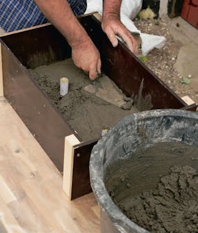 Laatikon valuun menee yllät-tävän paljon materiaalia: noin 45 kg soraa, 10-12 kg sementtiä ja 8-10 kg kasvuturvetta. Valumassa kannattaa sekoittaa pienemmis-sä annoksissa, sillä isoa an-nosta on raskasta käsitellä. Näin betonia ei myöskään mene hukkaan. Jotta sekoi-tussuhteet säilyisivät eri annoksissa samoina, käytä vain yhtä mittaa, esim. pientä muoviastiaa. Mittojen on oltava tarkat, jos betoni valmistetaan useassa erässä.