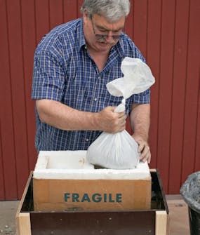 Aseta pahvilaatikko suoraan pohjalle niin, että joka sivuille jää 5 cm rakoa. Pahvilaatikon sivuja on vahvis-tettu polystyreenilla. Hiekka-pussit antavat laatikolle painoa.