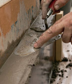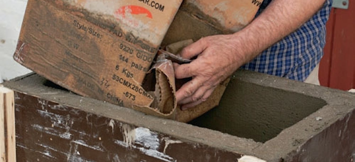 Peitä muotin pohja betonimassalla. Jaa massa tasaisesti laastikauhalla, jonka paksuus on 2-3 cm. Paina se hyvin sivuja vasten ja pahviputkien ympärille.