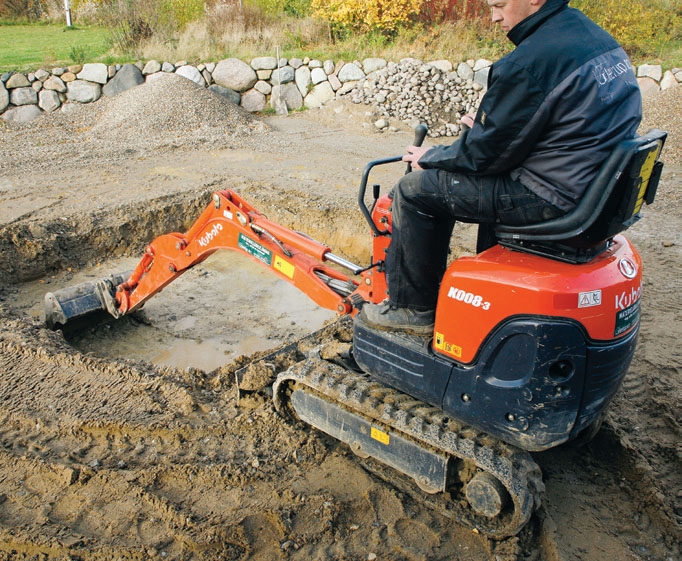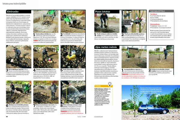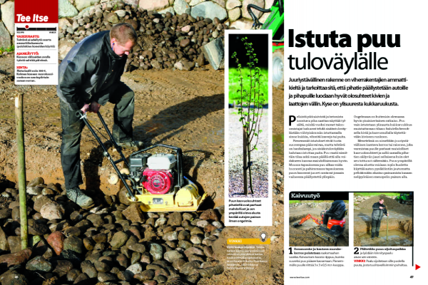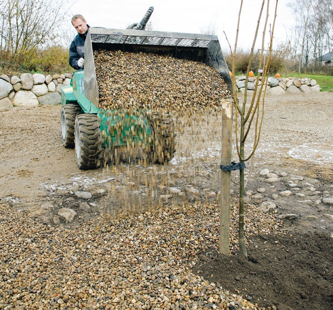 Meidän oli siirrettävä joitakin kuutioita maata, tarkalleen 4,5 m³, minkä vuoksi päätimme käyttää kaivamiseen kone-voimaa. Se helpottaa ja nopeuttaa työtä, eikä pienen kaivurin, kuormaajan ja täryttimen vuokraaminen maksa aivan mahdottomia. ”Kukkaruukuksi” kutsuttu rakenne, johon puu istutetaan, koostuu kahdesta kivikerroksesta ja kivien välisten onteloiden täyttämiseen käytettävästä mullasta. Kivirunko kantaa liikenteen rasitteen ja multa toimii puun juurten kasvualustana. Multaa ei siis paineta kasaan, jotta puun juuret pääsevät kasvamaan vapaasti, ilman että ne nostavat myöhemmin päällystettä ylöspäin.