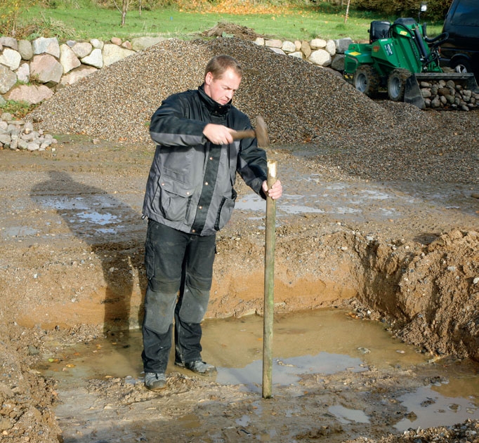 On tärkeää levittää kivet yhtenäiseksi ja tasaiseksi kerrokseksi kuoppaan, joka tässä oli mitoiltaan 3 m joka suuntaan ja syvyydeltään 0,5 m. Suuremmille puille tulee puun hyvinvoinnin takaamiseksi kaivaa vähintään metrin syvyinen kuoppa.