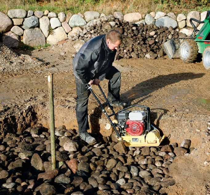 Ensimmäinen kivikerros saa olla korkeintaan yhden kiven korkuinen. Käytimme n. 90-120 mm:n kiviä. Vaihtoeh-toisesti voi käyttää noin 60 mm:n murskaa.