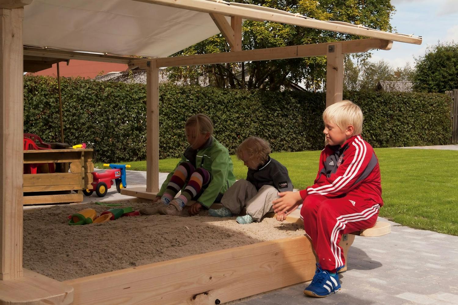 Vaakajuoksujen (E) päät muotoil-laan niin, että rimat (H) myötäilevät purjekangasta. Hiekkalaatikko näyttää persoo-nalliselta, kun päät ovat kaarevat. Vaakajuok-sun pituus, 242 cm, sallii 31 cm:n ”räystään”.