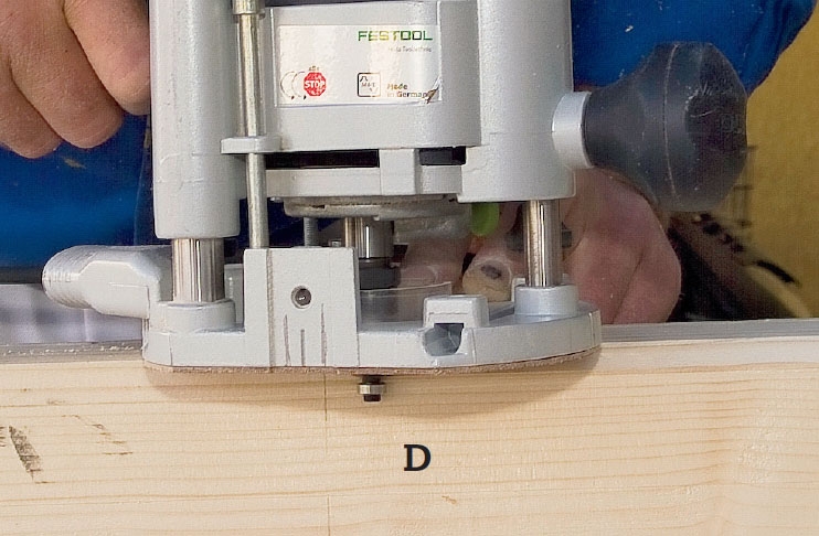 Sivut oikaistaan yläjyrsimellä. Jyrsi 45 asteen terällä leveä huullos, joka päättyy alhaalla 3 cm:n päähän penkistä, ylhäällä 3 cm:n päähän yläjuoksusta (E).