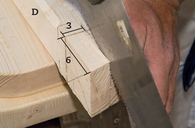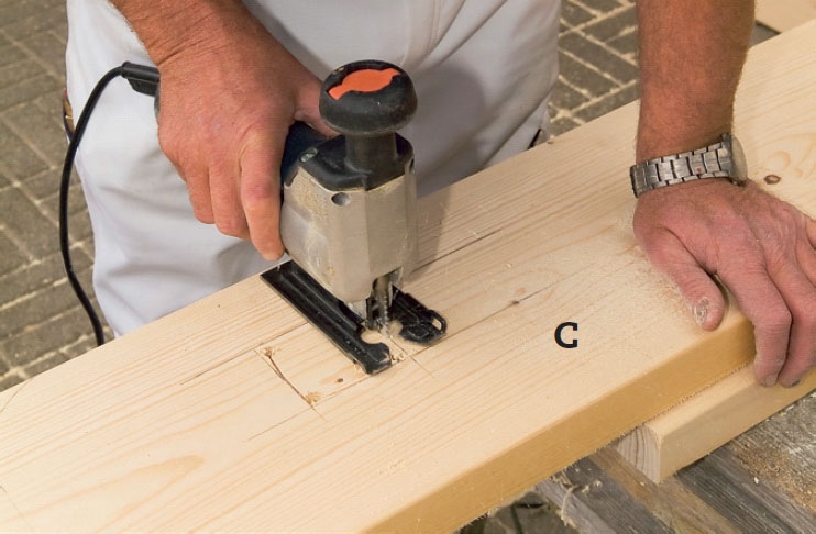 Penkkeihin (c) sahataan aukot tolpille (d). Ensin kulmiin porataan reiät 8 mm poralla, jotta sahanterä voidaan työntää läpi. Sen jälkeen tolpille sahataan neliskulmaiset aukot.