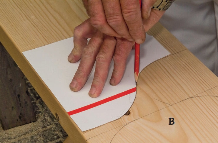 Kahden pitkän sivun (b) päädyt muotoillaan, esim. kulhon avulla niin, että päädyt kaartuvat tyylikkäästi ylöspäin penkkien (C) alla. Kaava leikataan pahvista ja muoto piirretään kaikkiin neljään päätyyn.