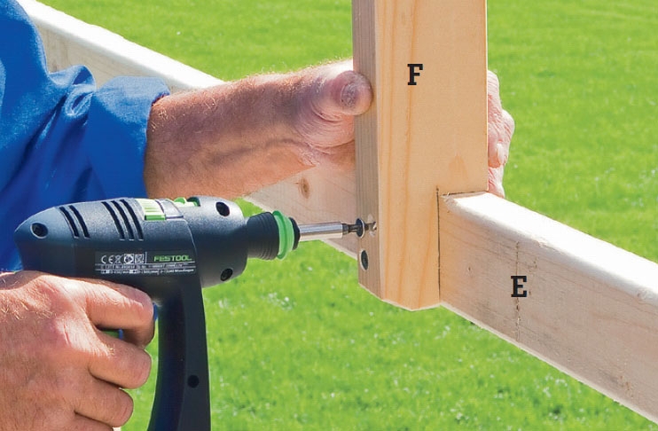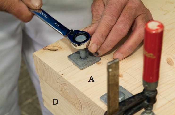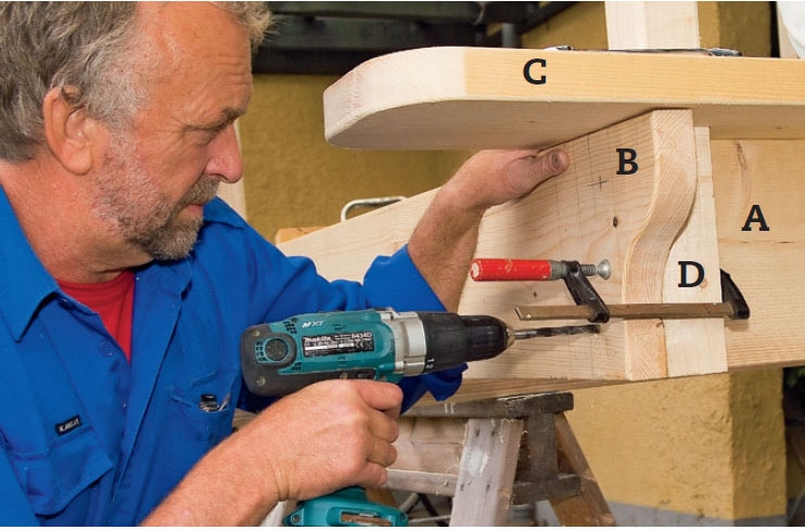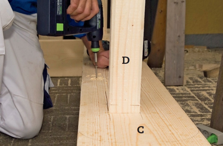 Tolpat (d) asetetaan lyhyiden sivu-jen (a) päälle päädyt samaan tasoon. 10 x 100 mm täkkiruuveja varten porataan sivujen (A) läpi 10 mm poralla, sitten tolppiin 6 mm poralla.