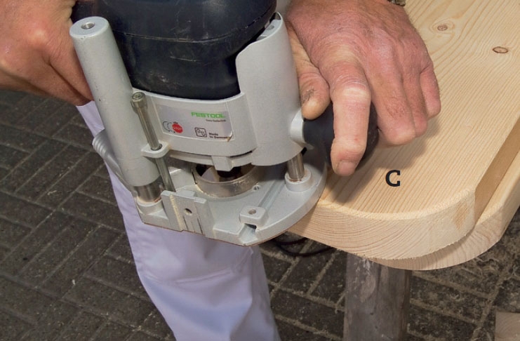 Penkkeihin (c) tehdään pyöreät kulmat ja reunat pyöristetään. Muoto tehdään samalla kaavalla kuin pitkiin sivuihin (B). Yläjyrsimeen on kiinnitetty pyöristysterä.