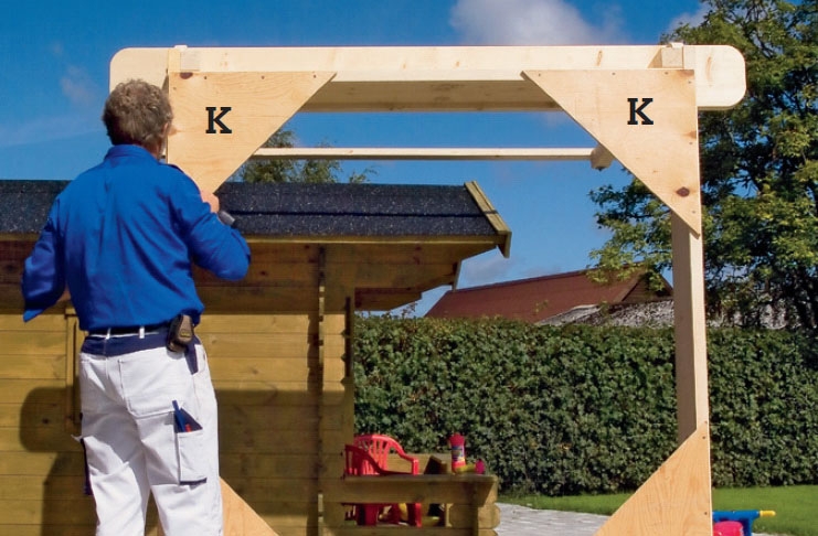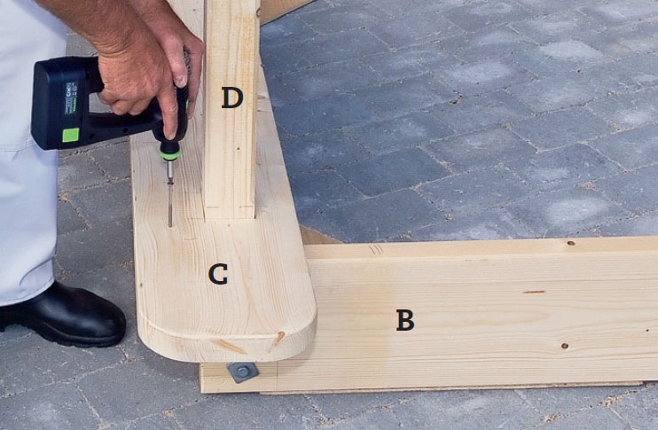Penkki (c) työnnetään tolppaan (d) ja kiinnitetään päätysivuun (A) 5 x 80 mm ruuveilla. Varmista, että penkki asettuu täysin suoraan kulmaan tolppiin nähden ennen kuin ruuvaat sen kiinni.