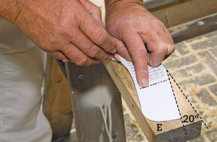Tolppia (D) varten ostetaan käsittele-mättömiä 75 x 150 mm lankkuja, jotta ei tarvitse käyttää painekyllästettyä puuta. Lankut halkaistaan kahdeksi 70 x 70 mm:n tolpaksi. Lankut on helpoin hal-kaista isolla pöytäpyörösahalla, mutta pyörösahakin käy, varsinkin jos siinä on ohjainkisko, jolloin lankku voidaan sahata molemmista sivuista. Tolppien päälle sahataan lovet yläjuoksuille (E).