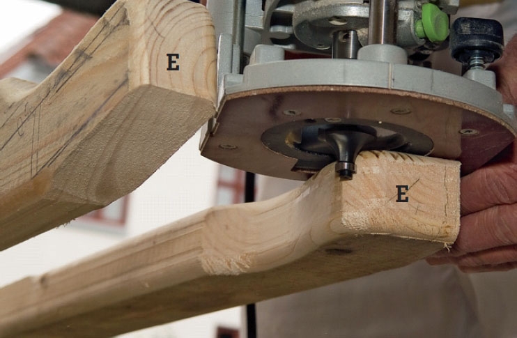 Vaakajuoksujen (E) reunat pyöris-tetään yläjyrsimellä, kun ne on ensin viistetty pistosahalla. Tässä käytetään 10 mm pyöristysjyrsinterää. Jyrsi reuna 2-3 kertaa, niin se näyttää siistiltä.