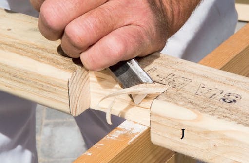 Harjaan (J) tehdään kaksi lovea, jot-ta se saadaan pystytolppiin kiinni. Ensin sahataan harja ja rimat pituuteen ja reunat pyöristetään. 25 mm syvä lovi taltataan auki. Sahatut viillot helpottavat talttaamista.