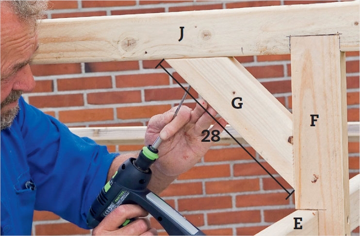 Vaakajuoksujen (E) keskelle asennetaan pystytolppa (F), joka tukee harjaa (J). Sahaa tolppaan lovi, jotteivät kaksi 5 x 80 m ruuvia kannattele katosta yksinään. Sido vaakajuoksut tolppiin (D) puupulteilla.