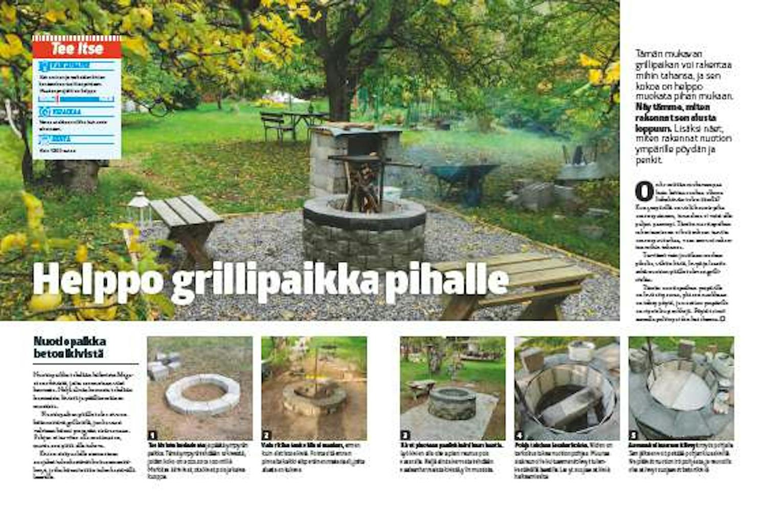 Nuotiopaikan päälle tulee sivuun käännettävä grilliritilä, jonka varsi valetaan kiinni ympyrän sisäreunaan. Pohjan ei tarvitse olla routimaton, mutta sen pitää olla tukeva.