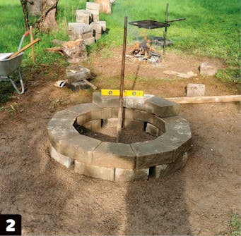 Pohja tehdään lecaharkoista. Niiden on tarkoitus tukea nuotion pohjaa. Muuraa sisäreunoille kuitusementtilevyt tulenkestävällä laastilla. Levyt suojaavat kiviä halkeamiselta.