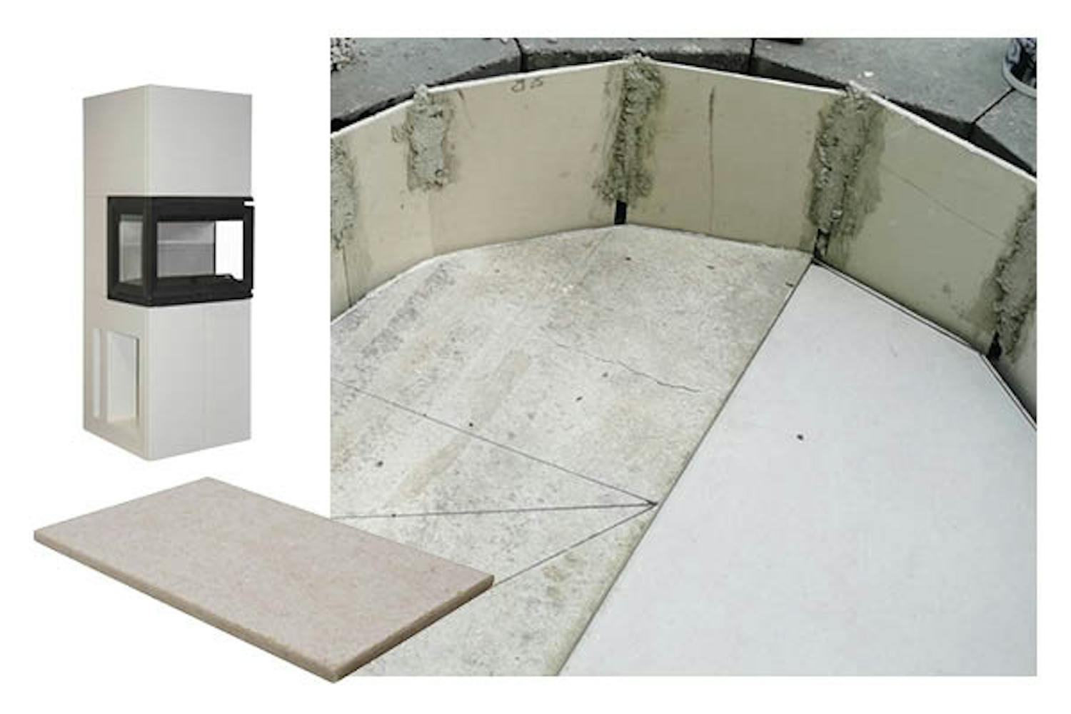Kivien sisäpuolelle asennetaan suojaksi tulenkestävät kuitusementtilevyt, jotka kiinnitetään tulenkestävällä laastilla.