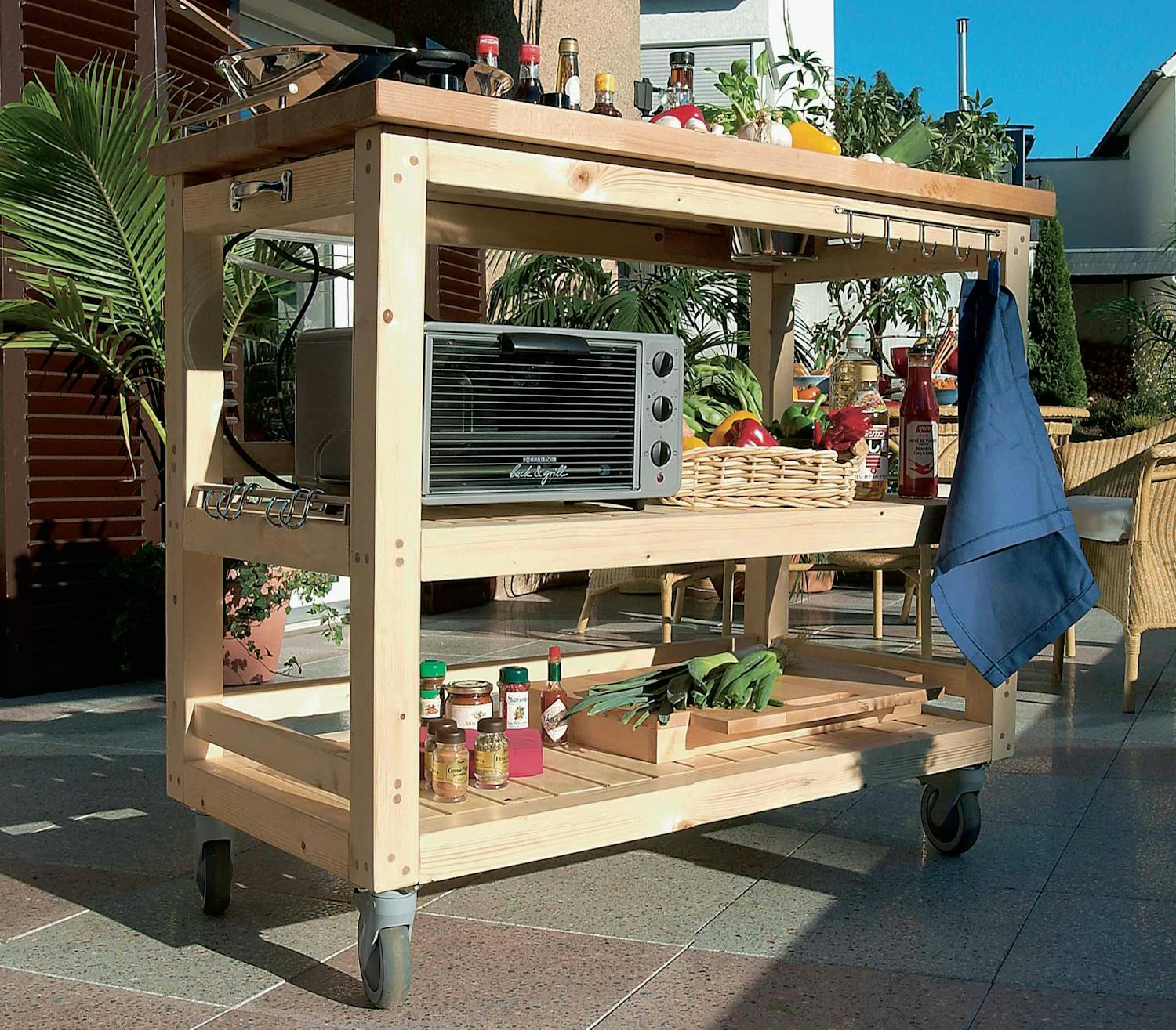 Pöydän kaksi alahyllyä ovat hyllynkan-nattimien varassa. Ylempään hyllyyn ja pöytälevyyn kiinnitetyt pitkät ja melko korkeat kaapinovien tai muut kalusteve-timet pitävät huolen siitä, etteivät keit-tiötarvikkeet putoile maahan.
