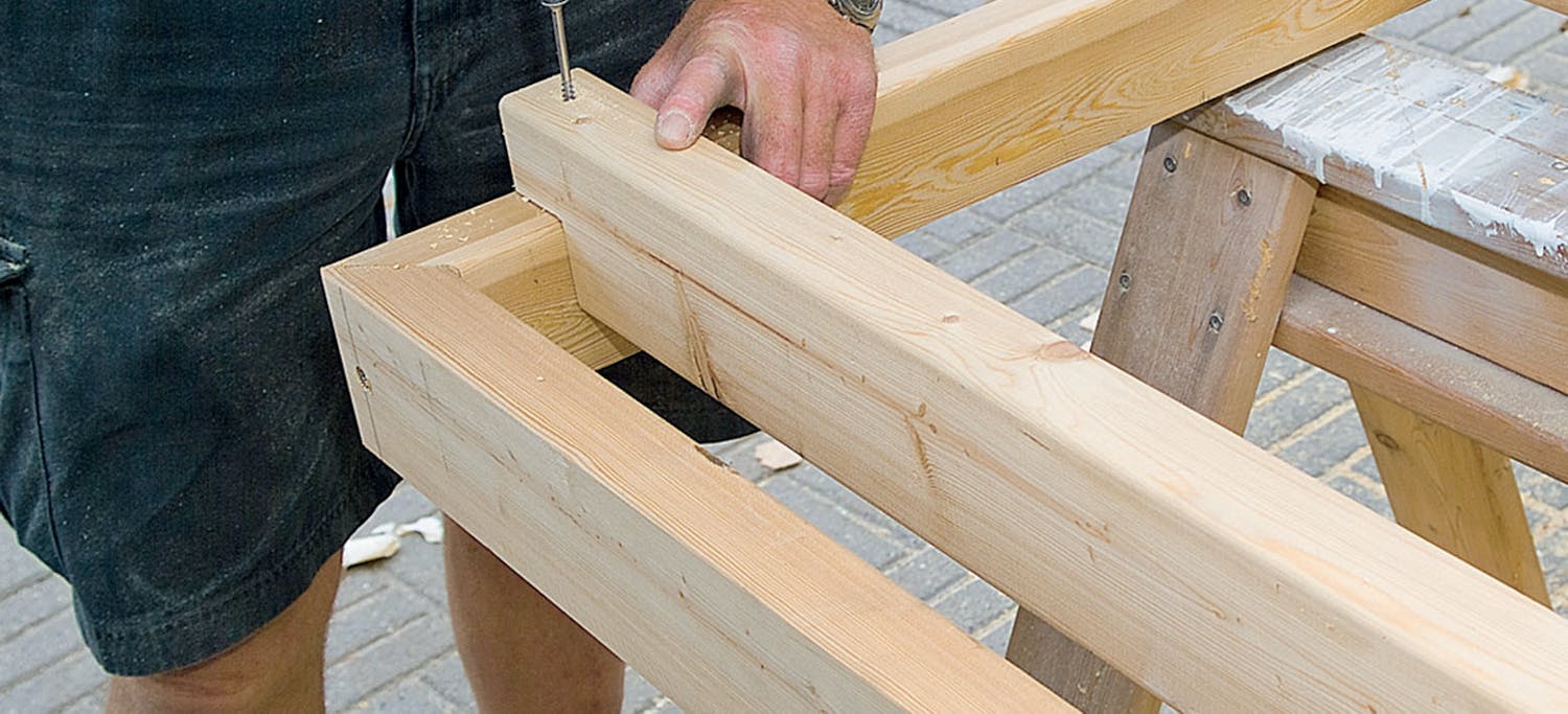 Sitten ruuvataan. Esiporaa 3 mm:n terällä. Järeillä 6 x 100 mm:n ruuveilla liitoksesta saadaan tiukka. Mahdolliset pienet epätasaisuudet häviävät ruuveja kiristämällä ja löysäämällä.