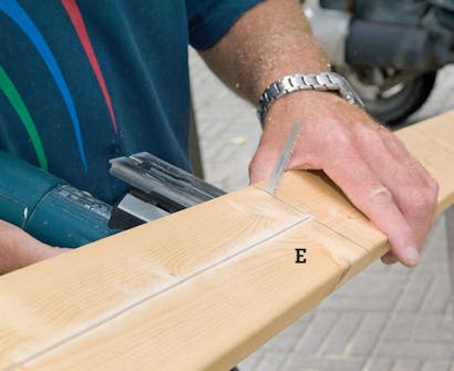Sahaa listat (E) pöydän alla olevaa tasoa varten. Listat pysyvät yhdessä kahdella rimalla. Rimat voi ostaa valmiina, mutta ne on myös helppo tehdä itse halkaisemalla höylätty lauta kahtia.