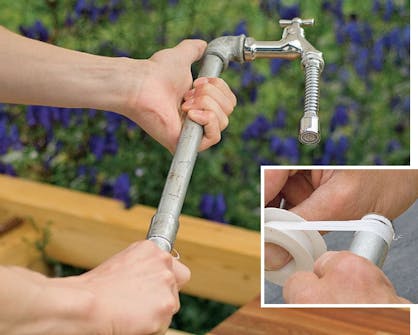 Kokoa vesihanan osat. Hana asetetaan pöydän taakse, ja siihen asennetaan nippa, jolla vesihana ja -letku yhdis-tetään. Pakkausteippiä on helppo käyttää.