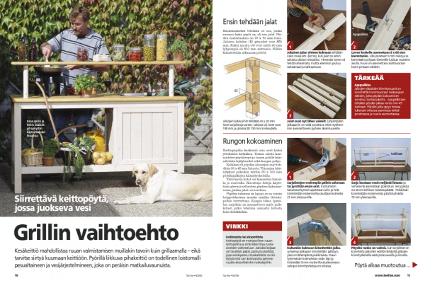 Pöydän koko on 62 x 160 cm ja maus-tehyllyn mitat 18 x 160 cm. Ne käsitellään värittömällä puunsuojalla ja mah-dollisesti lakataan ennen kiinnitystä. Maustehylly asennetaan pöydän päälle puutankojen varaan ja kiinnitetään ka-lusteruuveilla. Hyllystä tulee tällä ta-voin helposti irrotettava. Irrotusmahdol-lisuus on hyvä asia, kun pöytä siirretään varastoon talveksi.