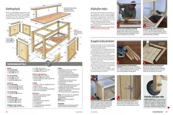 Pöydän rakenne on luja ja se on varsin helppotekoinen moniin muihin liitosta-poihin verrattuna. Kaapin tekoa ajatel-len sarjoihin on asennettava myös poik-kituet, jotka tehdään samasta listasta kuin kehikkokin.