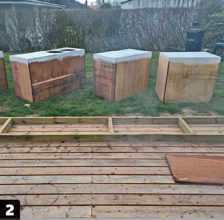 Tee sokkeli lankuista. Alakaapit tulevat 45x95 millin lankuista tehdyn sokkelin päälle. Lankut ovat painekyllästettyjä, ja ne asennetaan terassilautojen päälle.