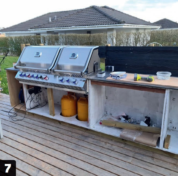 Elementit on maalattu ja grillipöydän alle on asennettu pystytuet. Myös elementtien taakse on asennettu rakennetta tukevat pystylankut.