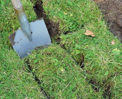 Poista nurmiturve lapion avulla sopivan kokoisina mättäinä päällystettävältä alalta. Työhön ei tarvita suuria koneita ja kaivuusta selviää lapiolla, talikolla ja kottikärryillä parissa tunnissa.