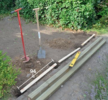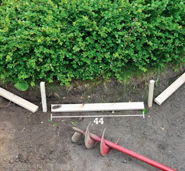 Kaiva tolppien kuopat maaporalla ja kapealla pistolapiolla. Mittaamiseen käy tetään kolmea listaa. Niiden pituus vastaa tolppaväliä. Ne asetetaan maahan osoitta maan tolppien paikkoja. Kaiva kuo pat rou dat tomaan (maaperän mukaan) syvyyteen.
