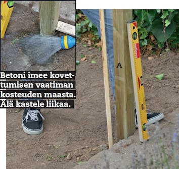 Varmista jatkuvasti, että tolppa (A) on täysin pystysuorassa. Betonin ei tarvitse olla läpikosteaa, sillä kiinteämpi beto ni tukee tolppaa paremmin. Betoni imee lähiviikkojen ajan maasta kosteutta.