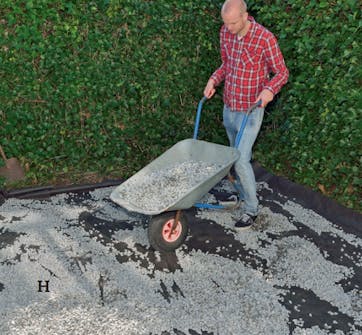 Levitä kankaalle sepeliä (H). Vaikka kyseessä on pieni alue, sepeliä joutuu ajamaan monta kottikärryllistä.