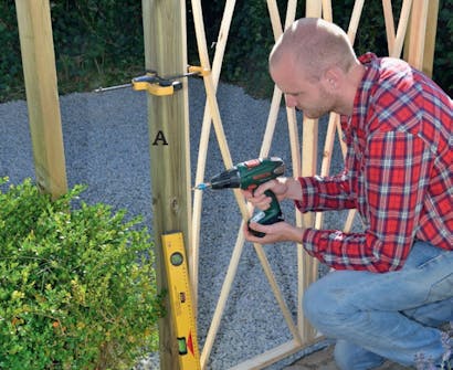 Kenttien täyttäminen kaarilistoilla ei vie kauan, ja tuloksena on kaunis ja ilmava säleikkö, jota pitkin köynnös-kasvit voivat kiivetä.