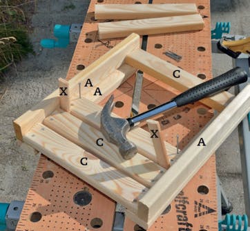 Kokoa kukkalaatikoiden kahdeksan jalkakappaletta (A) neljäksi jalaksi 1,8 x 35 mm:n uppokantanauloilla. Listat naulataan yhteen reuna reunaa vasten.