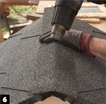 Asenna huopapaanut. Aloita katon alareunasta ja etene ylöspäin. Paanut nau lataan kiinni yläreunasta ja liimataan kiinni levyihin kumibitumiliimalla niistä kohdista, joissa ei ole valmista liimataustaa.