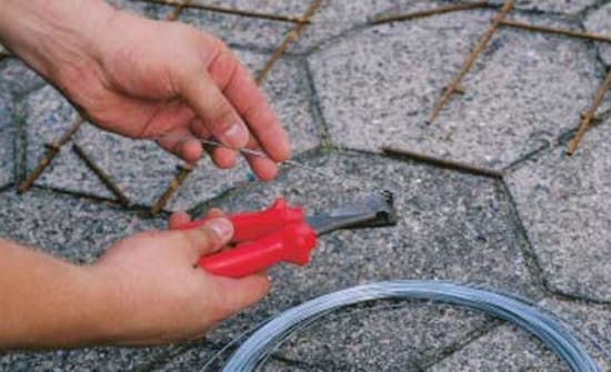 Sido yhteen kuusi 210 x 30 sentin kokoista osaakahden kolmionmuotoisen pylvään kanssa. Leikkaa pylväiden alaosat, jotta voit painaa ne kiinni maahan. Sido kolme 150 x 30 sentin kokoista osaa yhteen säleikön yläosaksi. Leikkaa yläosa kuten tässä ja työnnä pylväät kiinni niihin. Sido osat yhteen teräslangalla. Se on yhtä vahvaa kuin sidoslanka. Sido langat kiinni sekä vaaka- että pystysuunnassa vähintään neljästä kohdasta.