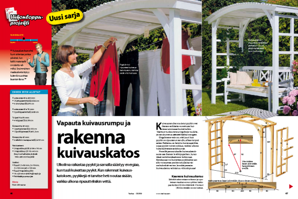 Jotta tuuli ja sade eivät kastelisi pyykkejä, kuivauskatos kannattaa sijoittaa pensasaidan, seinustan tai puuaidan suojaan.
