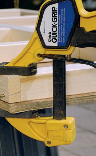 Säästät paljon aikaa käyttämällä rakentamisessa apuna pikapuristimia. Niissä on se etu verrattuna ruuvi-puristimiin, että niitä voi käyttää yhdellä kädellä. Niiden puristusvoima riittää pitämään kaksi kappaletta yhdessä ja säleiköt pystysuorassa kiinni tukilaudoissa maan tamppaamisen ajan. Etenkin kun työskentelet yksin, pikapuristimet ovat kuin ylimääräinen käsi.