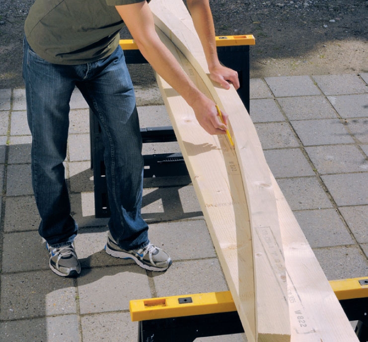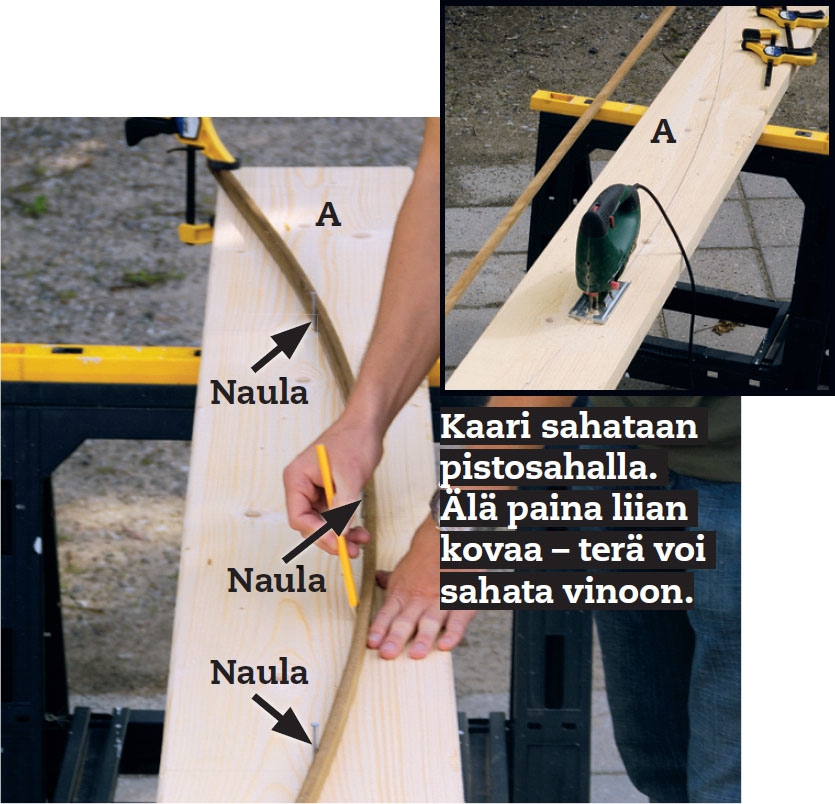 Aluksi rima kiinnitetään sahatavaraan viidestä kohtaa: kahdella ruuvipu-ristimella ja kolmella naulalla. Kun kaari on sahattu, uusi kaari piirretään ylöspäin lankulle (vaihe 2) ja sahataan. Paarretta käytetään toisen paarteen mallina uuden lankun päällä.