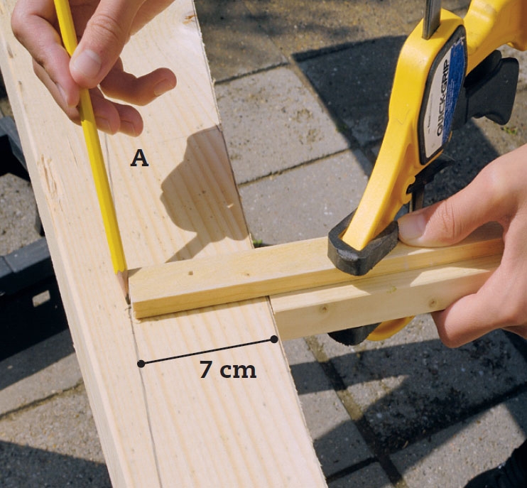 Kiinnitä vinotuet (B) kulmiinsa katkaisukohtien piirtämistä varten. Vinotuen ja tolpan väliin asetetaan 45 mm paksu kattopaarretta (A) vastaava puupala, joten vinotuki ja paarre ovat kohdakkain ja merkitseminen käy tarkasti.
