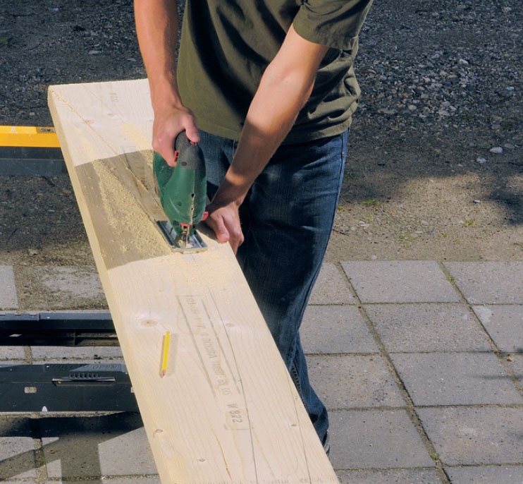 Sahaa toinen kattopaarre. Kattopaarteen sahaamiseen ei tarvita erityisen kapeaa terää, mutta anna terän etsiytyä ja sahata rauhassa puun läpi, jotta terä ei ala vähitellen vetää vinoon.