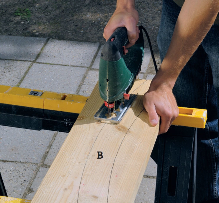 Sahaa vinotuet (B). Myös ne ovat kaarevia ja niin jyrkkiä, että piirrämme ne harpin virkaa toimittavan riman avulla, joka naulataan kaaren keskelle. Varminta on sovittaa pituus niin, että vinotukien päihin jää piirtovaraa reilusti.