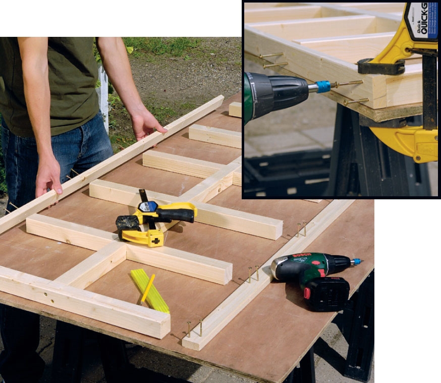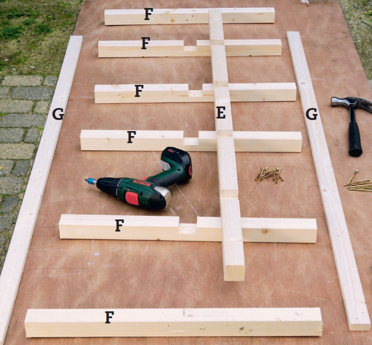 Puukehykset kasataan erillään tolpista ja tolpat kiinnitetään myöhemmin. Säleikön reunimmaiset pystyrimat (G) sahataan 24 x 45 mm:n rimasta ja kes-kimmäinen pystyrima (E) ja kaikki poik-kipienat (F) 45 x 45 mm:n rimasta. Koska reunarimat seisovat tolppien varassa, täyspaksun riman käyttäminen saisi ne näyttämään turhan massiivisilta.